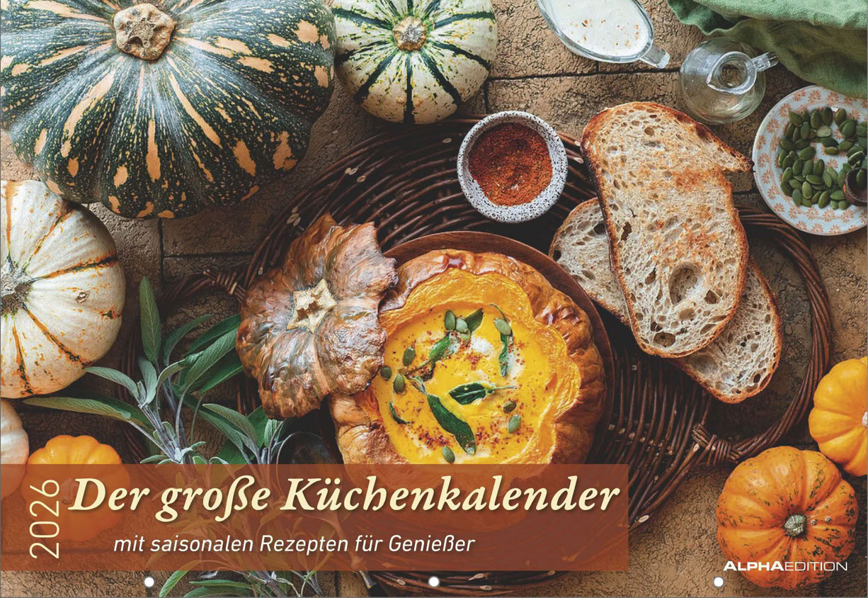 Der große Küchenkalender 2026 von Alpha Edition verbindet auf gelungene Weise Organisation und kulinarische Inspiration. Die hochwertigen Food-Fotografien schaffen Monat für Monat eine angenehme Atmosphäre, während die saisonalen Rezeptideen Lust machen, neue Gerichte auszuprobieren – ohne dabei kompliziert zu werden. Besonders hilfreich ist der Saisonkalender für Obst und Gemüse, der den Blick auf Regionalität und bewussten Einkauf lenkt.