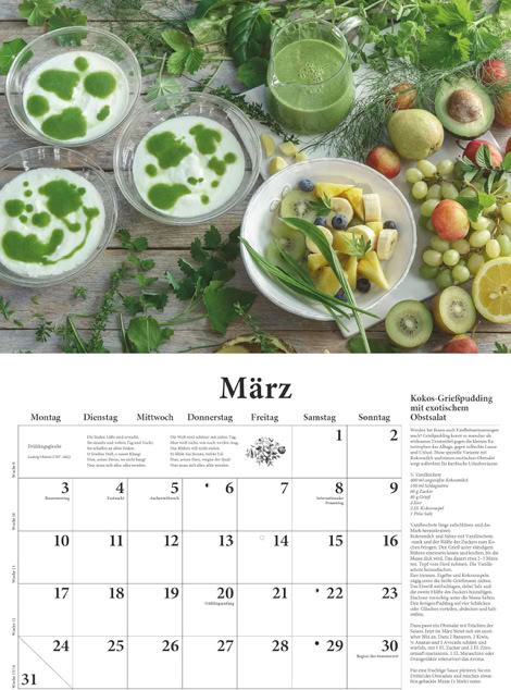 Zusätzlich enthält der Kalender praktische Tipps und Anregungen, die das Leben in der Küche bereichern. Ob schnelle Rezeptideen, Hinweise zur saisonalen Verfügbarkeit von Lebensmitteln oder clevere Küchentricks – die kleinen Extras sorgen Monat für Monat für neue Inspiration. Die hochwertige Verarbeitung des Kalenders, von der stabilen Papierqualität bis hin zum klaren und übersichtlichen Layout, macht ihn zudem zu einem verlässlichen Begleiter durch das Jahr.