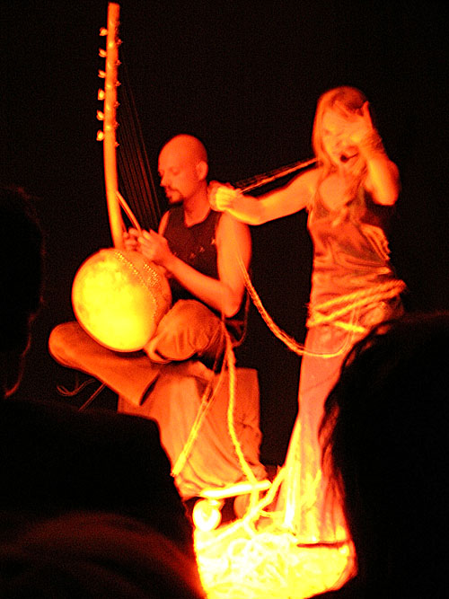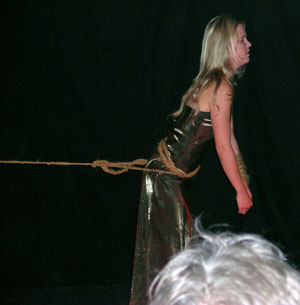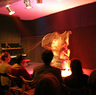 als Ausbildnerin an der AKT tätig ist. Mit einem Gesang wie von einem Delphin, hypnotisierte sie das zahlreich erschienene Publikum. Mit einem Seil zog sie ihren Freund auf die Bühne und spann dann ihr Netz